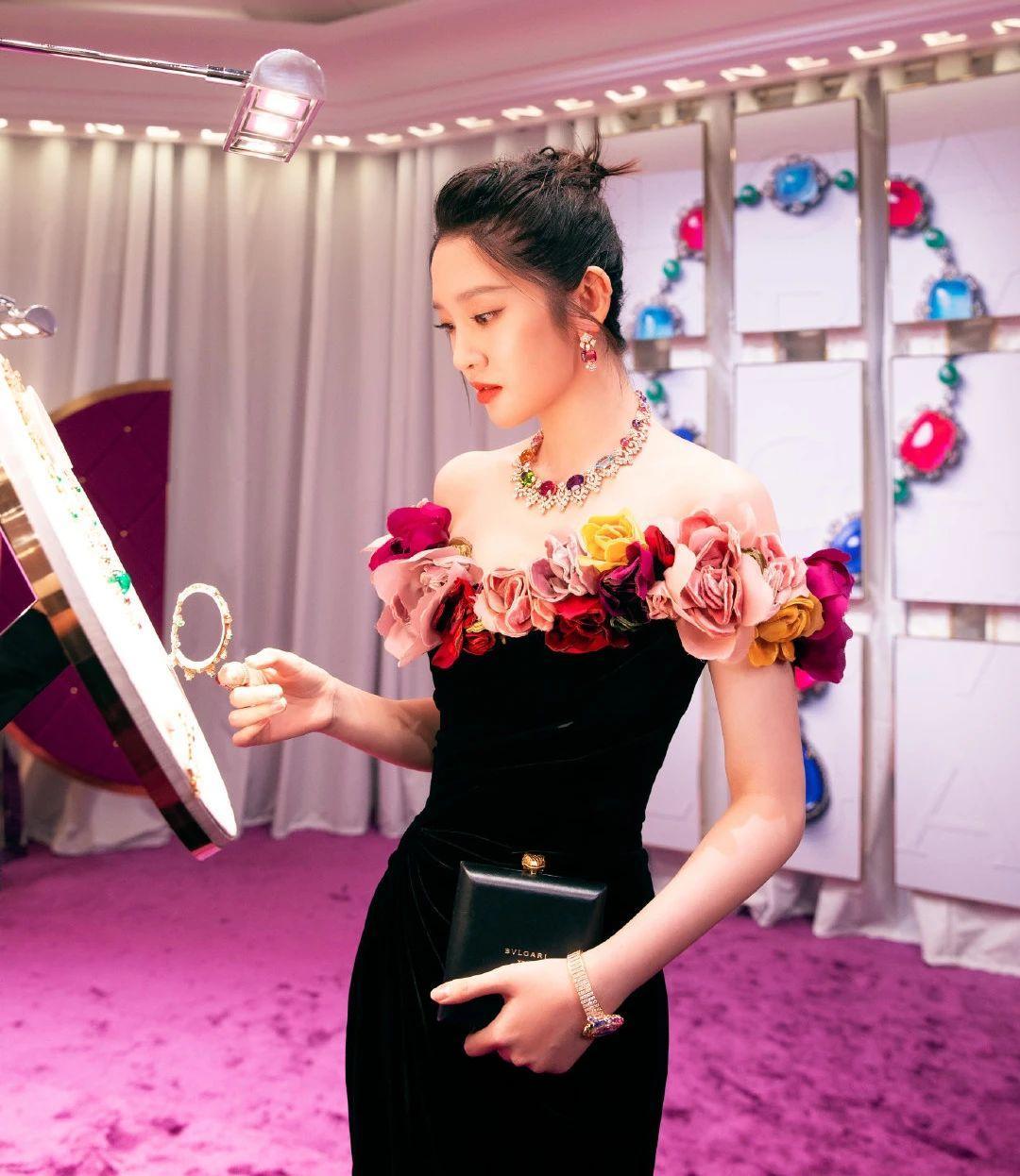 唐艺昕这条连衣裙采用了一字领的版型,一字领性感又撩人,完美的秀出了唐艺昕的肩胛骨曲线,这锁骨曲线简直美出天际,领口的这一圈鲜花设计也相当出彩,从视觉效果上缩窄了肩部曲线,小鸟依人又不失明艳大方。
