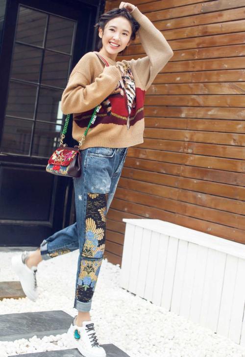 针织衫搭配牛仔裤也是早秋非常经典的搭配了,针织衫的保暖效果非常好,也非常百搭,短款的设计灵动活泼,非常适合矮个子的女生,下半身搭配的直筒牛仔裤设计感也很强,裤子上的金线刺绣充满了民族风的味道,浓浓的高定气息扑面而来,简单搭配一双小白鞋,青春减龄的同时又不失高级优雅。